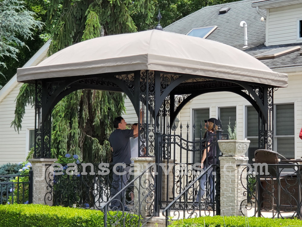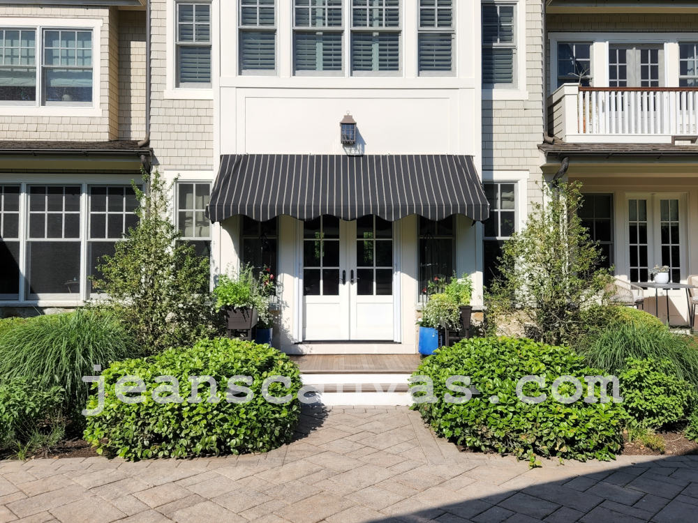 Jean’s Canvas Products provides custom designed and expertly installed awnings and canopies for your home. We will fabricate coordinated sets of awnings that will enhance both the beauty and the energy efficiency of your home. This home was outfitted with a full patio awning, box awnings over the casement windows and valences for the gazebo. All of our custom awnings are fabricated from Sunbrella in colors and patterns of your choice and then installed to rigorous specifications. A few photos and measurements is all Jean’s Canvas needs from you to provide a quote.